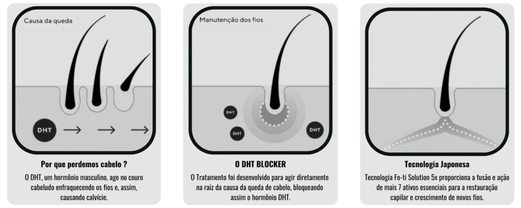 O DHT BLOCKER é uma formulação importada Japonesa que contém tudo o que você precisa para restaurar a sua saúde capilar e voltar a crescer cabelos em regiões falhas da cabeça. Ele age bloqueando o hormônio responsável por causar a queda de fios e o adoecimento do couro cabeludo.
